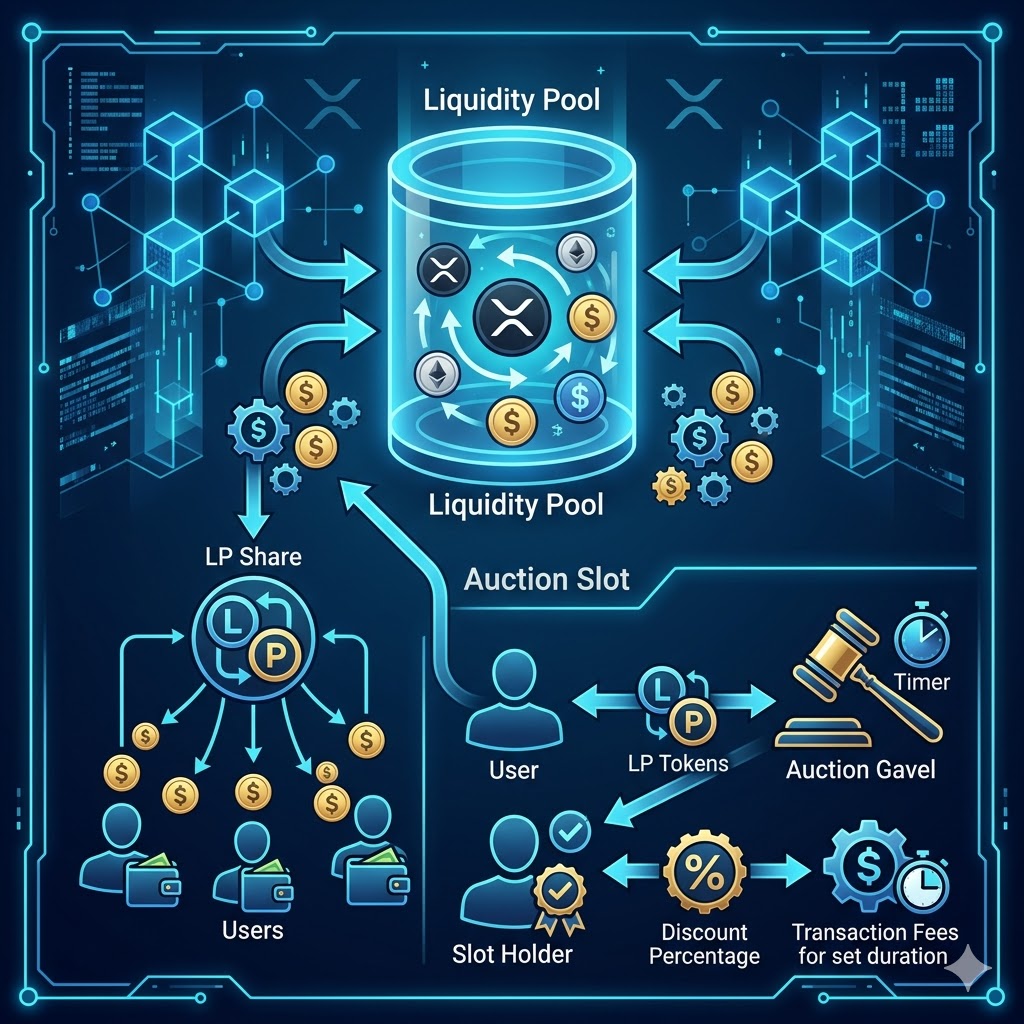 XRPL AMM에는 경매 슬롯(Auction Slot) 구조도 있습니다. 공식 문서 기준으로 LP가 LP토큰을 사용해 슬롯에 입찰할 수 있고, 슬롯 보유자는 일정 시간 동안 할인된 거래 수수료 혜택을 받습니다. 이 과정에서 입찰된 LP토큰은 AMM으로 돌아가므로 일반적인 예치 수익과는 다른 XRPL 고유 요소로 이해하는 것이 좋습니다.